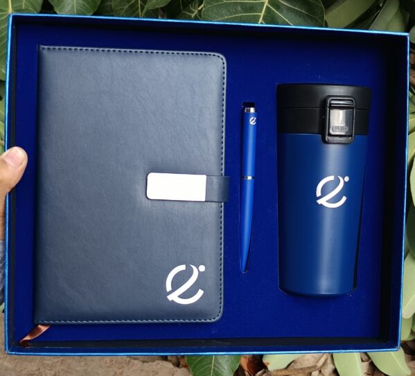The Blue Executive Set is a curated collection of three essential daily tools: a premium A5 diary, a vacuum-insulated tumbler, and a matching professional pen. Every item in this set features a consistent blue finish, designed to create a unified and sophisticated look for your brand. This set is ideal for corporate events, welcome kits, or as a thoughtful gift for clients and partners.